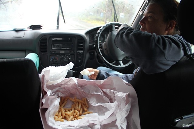 בשלב מסויים תפס אותנו המבול ולא ניתן היה לצאת מהרכב. עצרנו בעיירה קטנה, קנינו פיש אנד צ'יפס _בעיקר צ'יפס) ואכלנו באוטו כי לא היה מקום אחר…:
